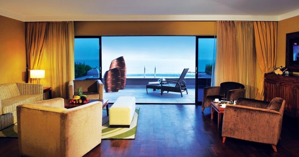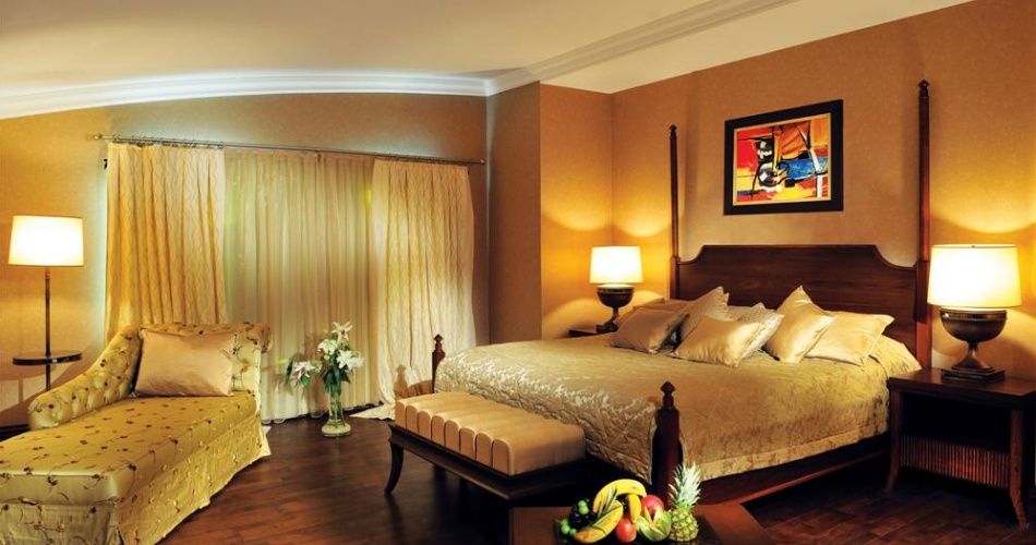 King Suite. Количество 2. Площадь 420 м2: в главном здании, на последнем этаже , с видом на море. Каждый номер состоит из гостиной и двух спален. В гостиной комнате находится мягкая мебель, телевизор LCD 40'' (система домашнего кинотеатра), обеденный стол на 6 чел., американский бар. Терраса 100 м2 с собственным бассейном площадью 40 м2, с мягкой мебелью, столом и стульями, шезлонгами с матрасами и зонтами. Одна спальня с french bed, диваном, ванная с джакузи, душем и парной, есть выход на террасу. Другая спальня с 2 twin beds, двумя креслами и журнальным столиком, ванная комната с ванной. Все спальни c межкомнатной дверью и телевизором LCD 37''. Покрытие пола – ковры и паркет, макс. 4+2 чел.