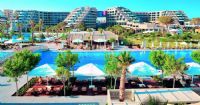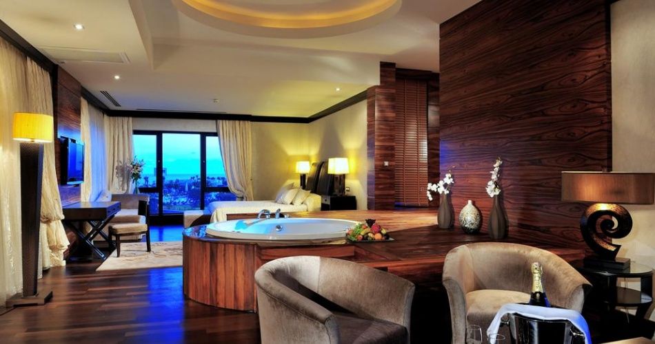 Royal Suite. Количество 15. Площадь 206 м2: в главном здании, со второго по шестой этаж ,с видом на море. Каждый номер состоит из гостиной и двух спален. В гостиной комнате находится мягкая мебель, телевизор LCD 37'', обеденный стол на 4 чел. Терраса 60 м2 с собственным бассейном площадью 20 м2, где находятся стол со стульями, шезлонги с матрасами и зонты. Одна спальня с 2 twin beds, другая с french bed. Все спальни c межкомнатной дверью, телевизором LCD 37'', двумя креслами и журнальным столиком, ванные комнаты с джакузи и душем. Покрытие пола – ковры и паркет, макс. 4+2 чел. VIP-сервис.