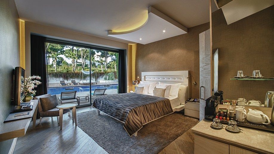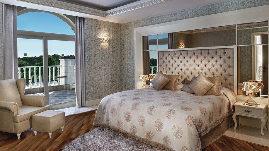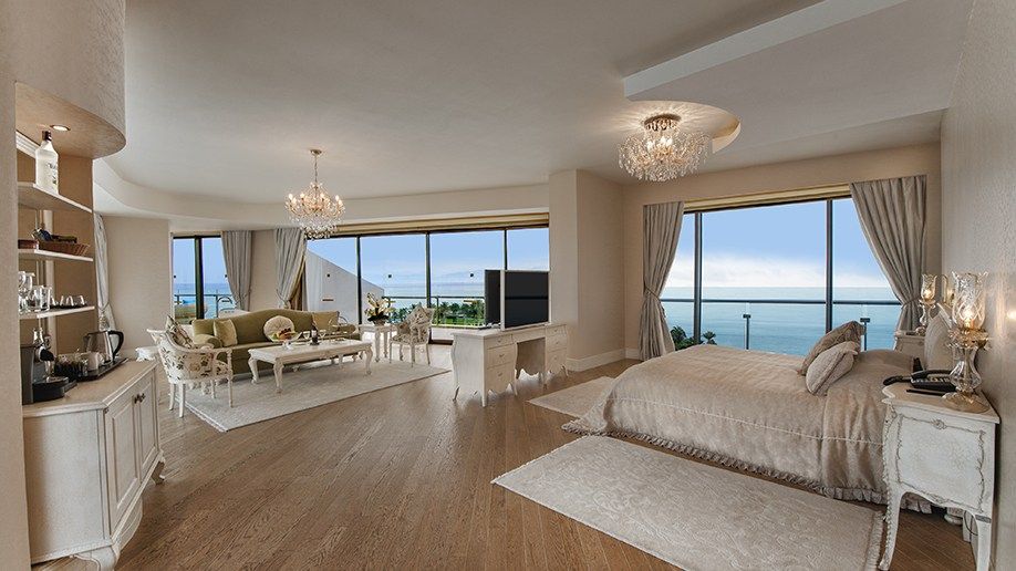 King Suite. Количество 1. Площадь  220 м². В главном здании отеля на пятом этаже расположен один трехкомнатный King Suite с видом на море. Номер состоит из гостиной и двух спален. В гостиной комнате находится мягкая мебель, телевизор LCD 42'' (DVD-плеер), обеденный стол на 6 чел., мини - кухня (плита, духовка, холодильник), гостевой туалет, балкон с двумя шезлонгами. Одна спальня с french bed, мягкий уголок, кресло и журнальный столик, гардеробная, ванная комната с джакузи и душем, сауна. Другая спальня с 2 twin beds, кресло и журнальный столик, ванная комната с душем. В спальных комнатах телевизоры LCD 42'' (DVD-плеер), межкомнатные двери, балконы с двумя шезлонгами. Покрытие пола – ламинат, ковер., макс. 6 чел.  VIP-сервис: VIP трансфер (из и до аэропорта); услуга терминала CIP аэропорта Анталии;  ежедневная газета (согласно национальности ); макси-бар; свежие экзотические фрукты; ассорти из орехов и сухофруктов; шампанское Dom Peregnion и цветы по приезду; турецкие сладости по приезду; сервис еды и напитков в сьюты; ресторан и бар для гостей вилл; частный павильон; экспресс-регистрация в гольф-клуб; клубный автомобиль; услуги дворецкого; услуги прачечной.