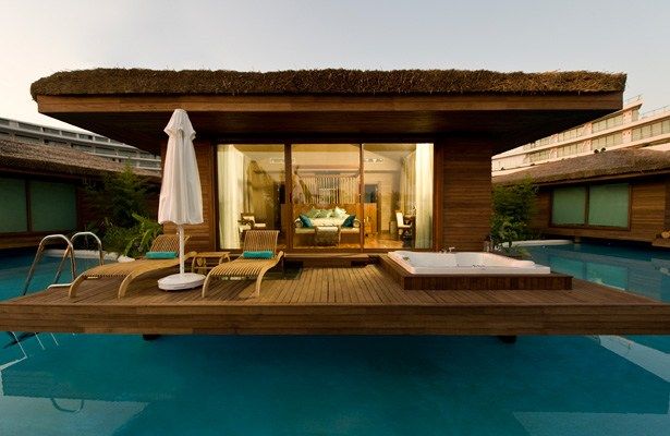 Maldives Villa. Количество 6. Площадь 80 м². На острове в Мальдивском бассейне расположены шесть частных одноэтажных Maldive Villa c прямым выходом в мальдивский  бассейн (4133 м2). Каждая вилла состоит из одной спальни. В спальной комнате находится french bed, телевизор LCD 42'' (DVD-плеер), мягкий уголок,  кресло и журнальный столик, письменный стол, ванная комната с душем. Терраса с джакузи, зонтики, матрасы и шезлонги, макс. 3 чел.