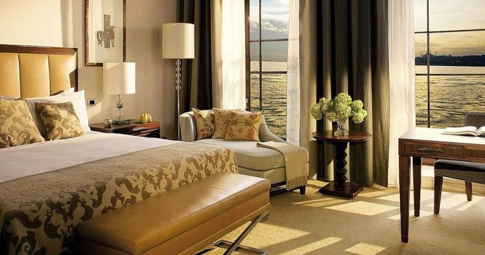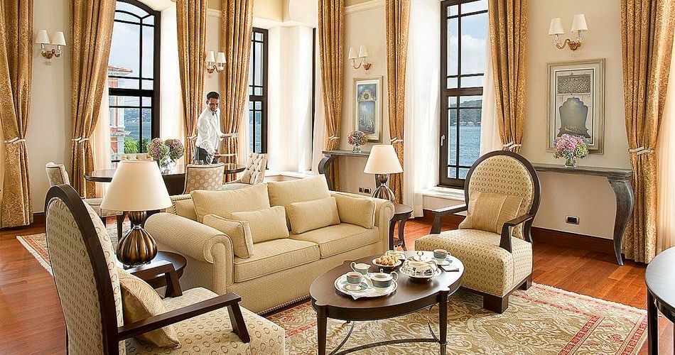 Two-bedroom Bosphorus palace suite (170 кв. м): гостиная со столовой зоной, 2 спальни (кровать king-size или две отдельные кровати), 2 ванные комнаты с ваннами и душем. Расположены в корпусе исторического дворца, на 1 и 2 этажах. Вид на пролив Босфор и сад.