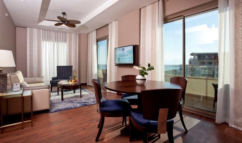 Suite Sea View. Количество 134. Площадь 79 м2. Вид на море и бассейн,1 спальня (двуспальная кровать), 1 гостиная ( раздвижныe двереи ) , 2 туалета, ванная с джакузи, 2 душа, терраса или балкон, макс. 3+1 чел.