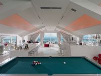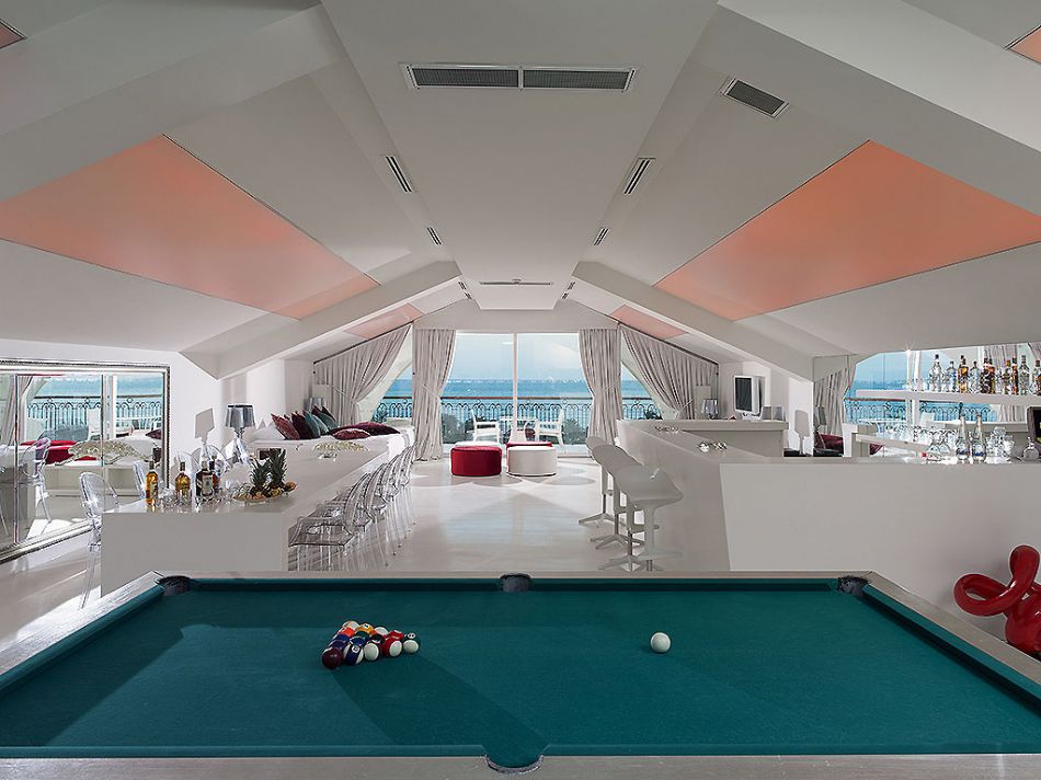 Madonna Suite.Количество 1. Площадь 175 м2. Находится на отдельном этаже, вид на море, мягкая мебель, барная стойка и обеденный стол, кровать king-size, сауна, бильярдный стол, ванная с джакузи и душем, терраса (22 м2), индивидуальный кондиционер, DVD-плеер, пол – эпоксидное покрытие, макс. 2 чел., VIP-сервис.