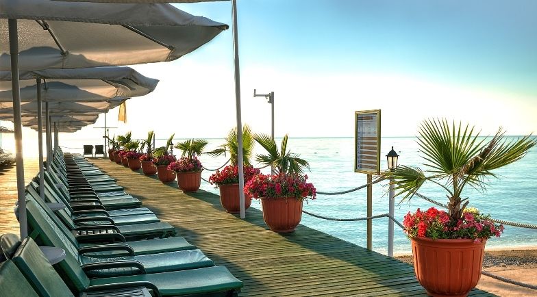 На пляже и у бассейна шезлонги, пляжные полотенца и зонты предоставляются бесплатно.