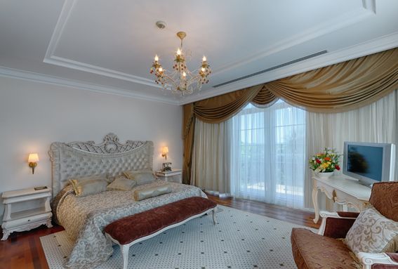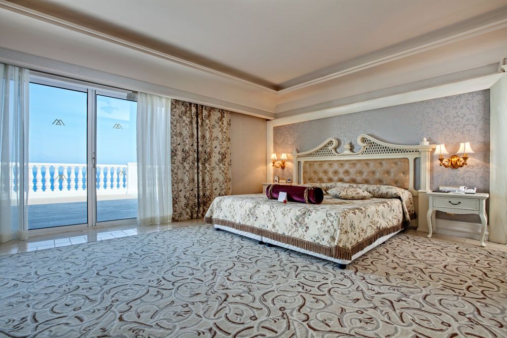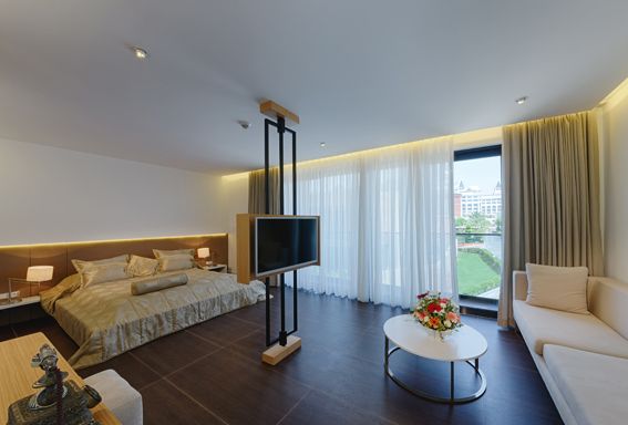 Deluxe: 273 deluxe standard room (макс. 3 чел.,   40 м2); 5 двухкомнатных deluxe family room (2 спальни, одна c дверью, 2 тв, макс. 4 чел., 70 м2); 17 двухкомнатных deluxe junior suite (1 спальня с  french bed, 1 гостиная комната 2 тв, макс. 3 чел., 63 м2); 7 двухкомнатных suite deluxe (спальня , гостиная с мягкой мебелью и столом, в некоторых номерах американская кухня, рабочий кабинет, ванная с ванной и душем, 2 тв, макс. 3 чел, 80 м2), с террасой; 2 трехкомнатных Suite major (2 спальни с  french bed , с дверью, гостиная с мягкой мебелью и столом, в одном из номеров американская кухня, рабочий кабинет, 3 тв, 2 ванныe, одна из них с джакузи, другая с душем, гардеробная комната, терраса 75 м2, оборудованная зонтиками, шезлонгами и столиком, макс. 4 чел., 175 м2, VIP-сервис).