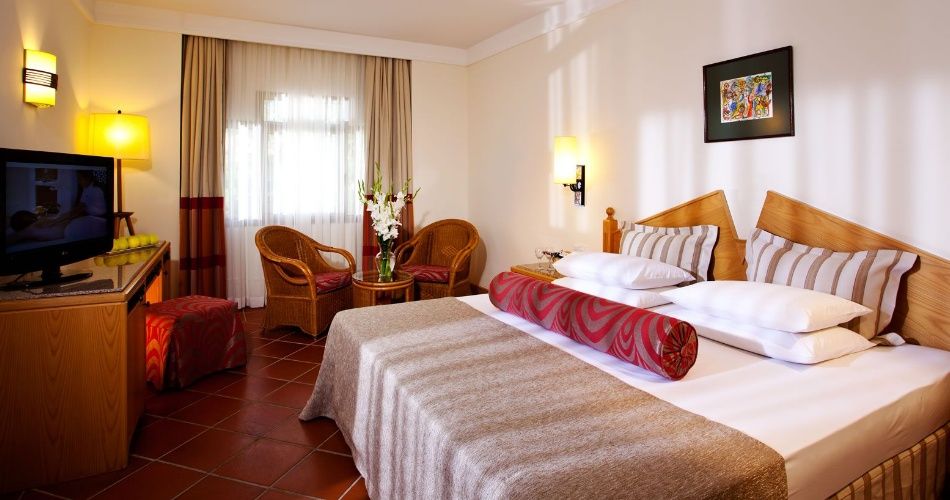 В номерах: мини-бар, центральный кондиционер, телефон, сейф, телевизоp, 1 двуспальная или 2 одноcпальные кровати, ванная комната с ванной, фен,  балкон или терраса, халаты, тапочки, полотенца, ковровое покрытие пола в основном корпусе кроме коттеджей-бунгало (плитка) , Wi-Fi (на всей территории отеля) и система Dial-Up в бунгало.