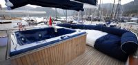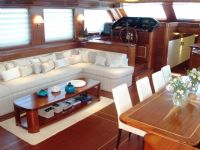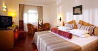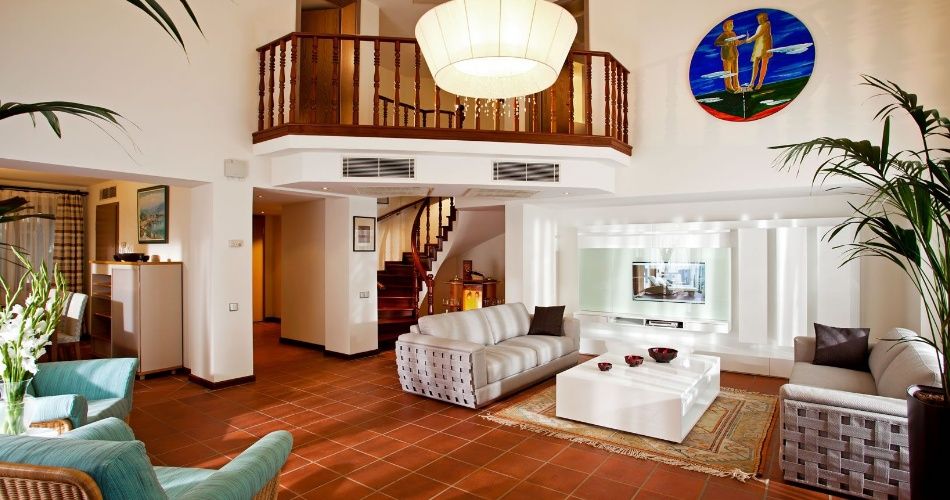 Golf Suite. Количество 1. Площадь 100 м2: в главном здании, на четвертом этаже , с видом на море и на поле для гольфа. Номер состоит из гостиной и двух спален. В гостиной комнате находится мягкая мебель, телевизор LCD 32''. Одна спальня с french bed, другая спальня с 2 twin beds. Все спальни с телевизором LCD 32'', двумя креслами и журнальным столиком, межкомнатными дверями, ванные комнаты с джакузи. Терраса со столом и стульями, шезлонги. Покрытие пола – ковролин, паркет, макс. 6 чел. VIP-сервис.