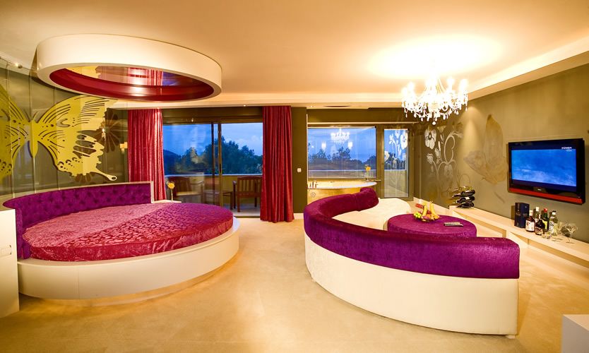 BUTTERFLY ROOM. Количество 2. Площадь 60м2. Комфортабельные номера состоящие из спальни, ванной комнаты. В номере: индивидуальный кондиционер, круглая кровать, мягкий уголок, гардеробная, джакузи с видом на море, душ-шарко, макс. 2 чел.
